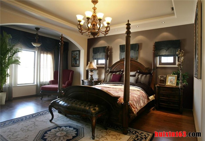 整体色彩构欢快流畅、均匀稳妥。以浓重的色线表达,详述欧式风格理念。意在体现欧式系列传统家装的厚重之感。欧式的床体造型和床品摆件,欧款的吊灯设计,欧式的线条勾勒,配合着欧式地砖拼花的衬托,将欧式风格卧室的设计案协调处理得优雅别致,温馨舒适。