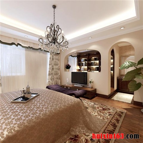 顶棚的处理简洁明快,线条勾勒自然灵活。设计以极富欧洲浪漫主义情怀的线调进行整体调控,欧式系列家具配饰来进行总体妆点,同时运用欧式元素符号来进行配合,使整体彰显和谐统一的气势。总体让卧室的功能性得以尽情体现,让舒适性和功能性的发挥更为完善,更为得体。