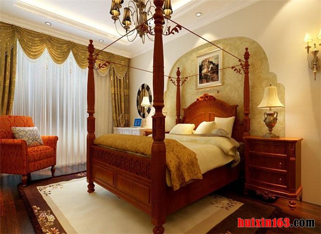 卧室的私密性当然是设计师应该考虑的一个环节,做为欧式风格的卧室设计理念,在注重私密性的同时,对于方便、简洁、和谐的处理原则也极为重视,从地面处理、墙面处理、顶棚处理三方面的色彩运用、线条勾勒来分析,总体彰显高雅舒适、浪漫温馨的欧式传统优雅格调气息。