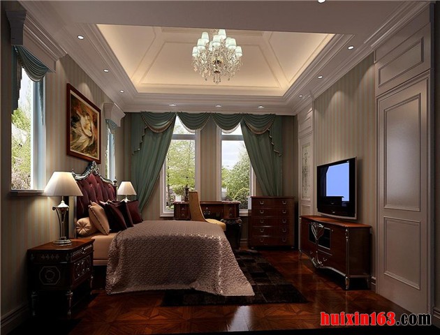 卧室的私密性当然是设计师应该考虑的一个环节,做为欧式风格的卧室设计理念,在注重私密性的同时,对于方便、简洁、和谐的处理原则也极为重视,从地面处理、墙面处理、顶棚处理三方面的色彩运用、线条勾勒来分析,总体彰显高雅舒适、浪漫温馨的欧式传统优雅格调气息。