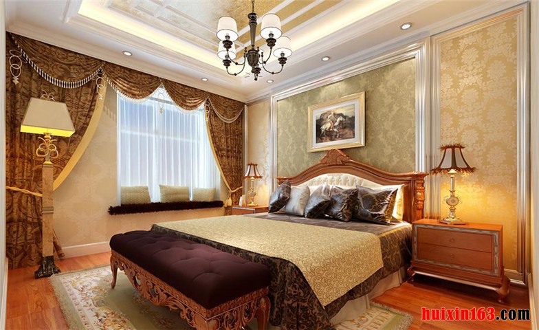 卧室的私密性当然是设计师应该考虑的一个环节,做为欧式风格的卧室设计理念,在注重私密性的同时,对于方便、简洁、和谐的处理原则也极为重视,从地面处理、墙面处理、顶棚处理三方面的色彩运用、线条勾勒来分析,总体彰显高雅舒适、浪漫温馨的欧式传统优雅格调气息。