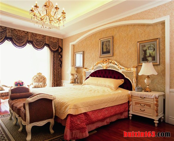 卧室的私密性当然是设计师应该考虑的一个环节,做为欧式风格的卧室设计理念,在注重私密性的同时,对于方便、简洁、和谐的处理原则也极为重视,从地面处理、墙面处理、顶棚处理三方面的色彩运用、线条勾勒来分析,总体彰显高雅舒适、浪漫温馨的欧式传统优雅格调气息。