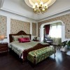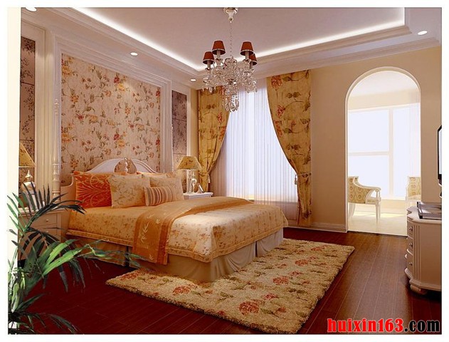 卧室的私密性当然是设计师应该考虑的一个环节,做为欧式风格的卧室设计理念,在注重私密性的同时,对于方便、简洁、和谐的处理原则也极为重视,从地面处理、墙面处理、顶棚处理三方面的色彩运用、线条勾勒来分析,总体彰显高雅舒适、浪漫温馨的欧式传统优雅格调气息。