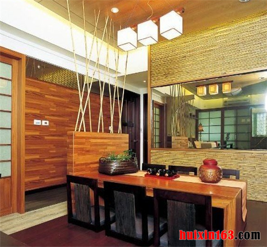 从直观效果一眼就可以断定,这是典型的日式风格的餐厅设计,色系搭配,色调运用,色彩协调,都讲究日系通常使用的风格,家具配饰的造型款式,细腻的线条在空间内的尽情勾勒,都以日式较为明显的理念进行操作。对于背景墙的整体处理,墙纸的择,交叉使用漆面涂刷的形式,大量木质建材的使用,都符合日式风格系列家装的一惯作法。