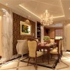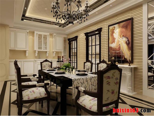 无论是在空间划分和整体布局方面,还是色彩搭配运用以及线条勾勒处理方面,都以极具美式风格的笔调进行刻画。使餐厅的功能性得以充分体现的同时,对职能空间的舒适性也进一步进行烘托,同时,艺术性和观赏性的考虑也遵循了一定的美式系列家装的规律来进行,完全做到协调一致。