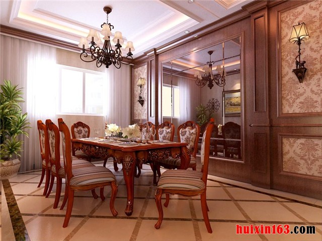 无论是在空间划分和整体布局方面,还是色彩搭配运用以及线条勾勒处理方面,都以极具美式风格的笔调进行刻画。使餐厅的功能性得以充分体现的同时,对职能空间的舒适性也进一步进行烘托,同时,艺术性和观赏性的考虑也遵循了一定的美式系列家装的规律来进行,完全做到协调一致。