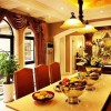 设计师在整套房屋的的装修设计方面,严格遵循美式风格的特点元素,根据户型和空间的优势,利用色彩的渲染和线条的勾勒,进行合理的空间布局,发挥餐厅家具配饰的妆点作用,以和谐舒适、恬静优雅的职能空间环境烘托为突破口,协调建材质地的情绪表达,体现餐厅的功用效果。