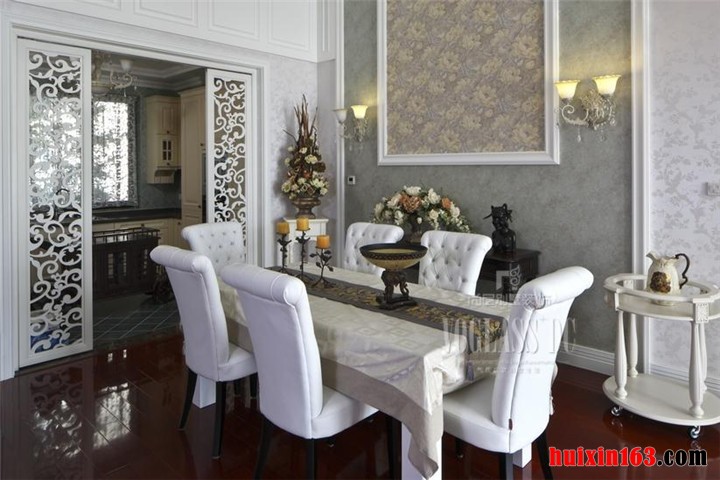 设计师在整套房屋的的装修设计方面,严格遵循美式风格的特点元素,根据户型和空间的优势,利用色彩的渲染和线条的勾勒,进行合理的空间布局,发挥餐厅家具配饰的妆点作用,以和谐舒适、恬静优雅的职能空间环境烘托为突破口,协调建材质地的情绪表达,体现餐厅的功用效果。