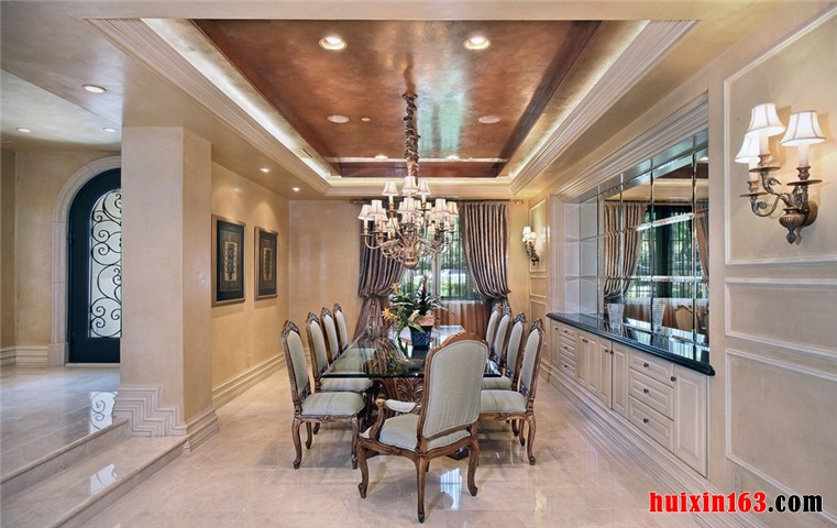 顶棚处理优雅别致,趣味盎然。造型或稳键,或有变,或流畅,或蜿蜒,都以美式的风格理念为依托,趋步向前,如苍穹般的存在,给整个职能空间的观赏和艺术性增添了必要的依据。石膏线勾勒石膏板的处理,配合着区域空间其它或大或小,造型迥异的色块拼接,美观大方。