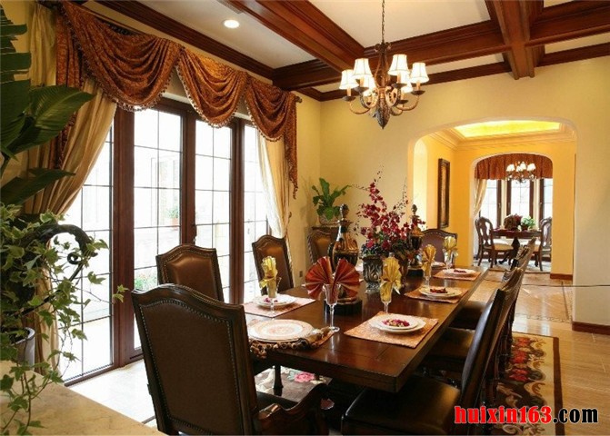 餐厅做为用餐的职能空间,家具配饰方面当然要以实用性主要原则。具体到美式风格的设计理念之下,餐桌椅的配置,造型款式,辅助用餐设施选择,都极尽美式风格的风格特点,餐桌椅等主要餐厅家具配饰及辅助家具对于整个职能空间的空间划分,也有很大的影响作用。从直观效果来看,设计师很好做到了整体和局部的统一调配。