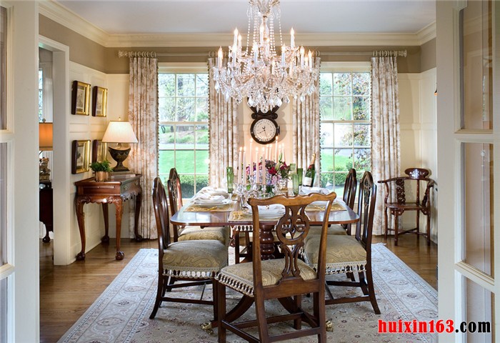 餐厅做为用餐的职能空间,家具配饰方面当然要以实用性主要原则。具体到美式风格的设计理念之下,餐桌椅的配置,造型款式,辅助用餐设施选择,都极尽美式风格的风格特点,餐桌椅等主要餐厅家具配饰及辅助家具对于整个职能空间的空间划分,也有很大的影响作用。从直观效果来看,设计师很好做到了整体和局部的统一调配。