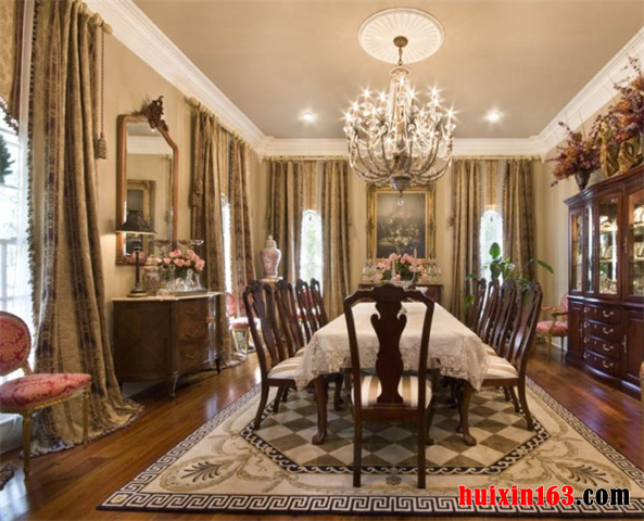 餐厅做为用餐的职能空间,家具配饰方面当然要以实用性主要原则。具体到美式风格的设计理念之下,餐桌椅的配置,造型款式,辅助用餐设施选择,都极尽美式风格的风格特点,餐桌椅等主要餐厅家具配饰及辅助家具对于整个职能空间的空间划分,也有很大的影响作用。从直观效果来看,设计师很好做到了整体和局部的统一调配。