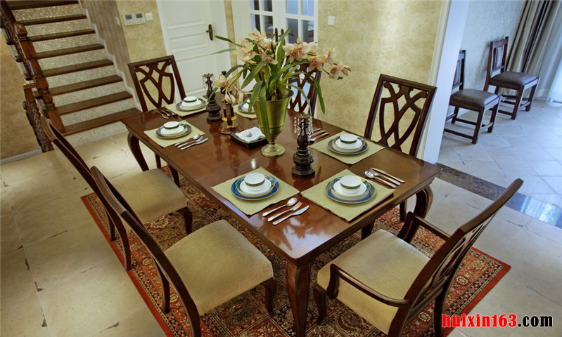 餐厅做为用餐的职能空间,家具配饰方面当然要以实用性主要原则。具体到美式风格的设计理念之下,餐桌椅的配置,造型款式,辅助用餐设施选择,都极尽美式风格的风格特点,餐桌椅等主要餐厅家具配饰及辅助家具对于整个职能空间的空间划分,也有很大的影响作用。从直观效果来看,设计师很好做到了整体和局部的统一调配。