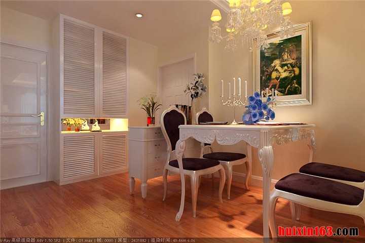 餐厅做为用餐的职能空间,家具配饰方面当然要以实用性主要原则。具体到美式风格的设计理念之下,餐桌椅的配置,造型款式,辅助用餐设施选择,都极尽美式风格的风格特点,餐桌椅等主要餐厅家具配饰及辅助家具对于整个职能空间的空间划分,也有很大的影响作用。从直观效果来看,设计师很好做到了整体和局部的统一调配。