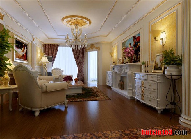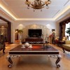 顶棚的处理极具欧式系列家装的特点,大型的吊灯灯池,配合精彩的的欧式吊灯,加上欧式造型明显的家具配饰,将整个客厅的情绪表达的淋漓尽致。地板的处理妥当稳重,墙壁处理十分具有欧式风范儿,整体设计连惯稳妥,精彩无限。