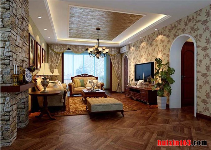 顶棚的处理极具欧式系列家装的特点,大型的吊灯灯池,配合精彩的的欧式吊灯,加上欧式造型明显的家具配饰,将整个客厅的情绪表达的淋漓尽致。地板的处理妥当稳重,墙壁处理十分具有欧式风范儿,整体设计连惯稳妥,精彩无限。