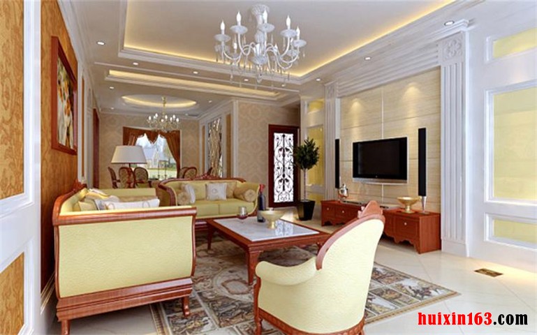 顶棚的处理极具欧式系列家装的特点,大型的吊灯灯池,配合精彩的的欧式吊灯,加上欧式造型明显的家具配饰,将整个客厅的情绪表达的淋漓尽致。地板的处理妥当稳重,墙壁处理十分具有欧式风范儿,整体设计连惯稳妥,精彩无限。