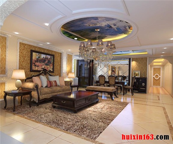顶棚的处理极具欧式系列家装的特点,大型的吊灯灯池,配合精彩的的欧式吊灯,加上欧式造型明显的家具配饰,将整个客厅的情绪表达的淋漓尽致。地板的处理妥当稳重,墙壁处理十分具有欧式风范儿,整体设计连惯稳妥,精彩无限。
