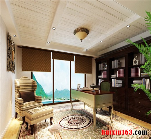 设计师严格遵循此种风格的设计理念,以科学严谨的创作态度,利用合理的空间布局,清晰的空间层次划分,家具配饰的点缀作用,把欧式书房所具有浓重文化氛围,以及优雅大气的外在表现,都通过细节点点滴滴的表达出来,达到了良好的效果。