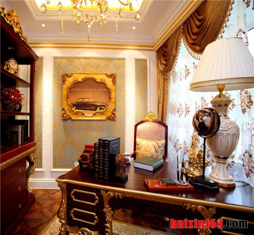 设计师严格遵循此种风格的设计理念,以科学严谨的创作态度,利用合理的空间布局,清晰的空间层次划分,家具配饰的点缀作用,把欧式书房所具有浓重文化氛围,以及优雅大气的外在表现,都通过细节点点滴滴的表达出来,达到了良好的效果。