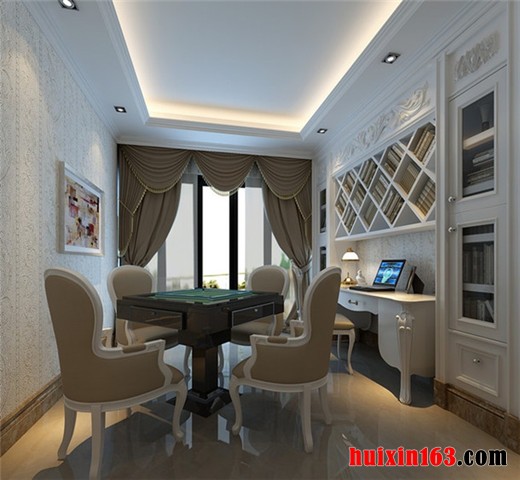 设计师严格遵循此种风格的设计理念,以科学严谨的创作态度,利用合理的空间布局,清晰的空间层次划分,家具配饰的点缀作用,把欧式书房所具有浓重文化氛围,以及优雅大气的外在表现,都通过细节点点滴滴的表达出来,达到了良好的效果。