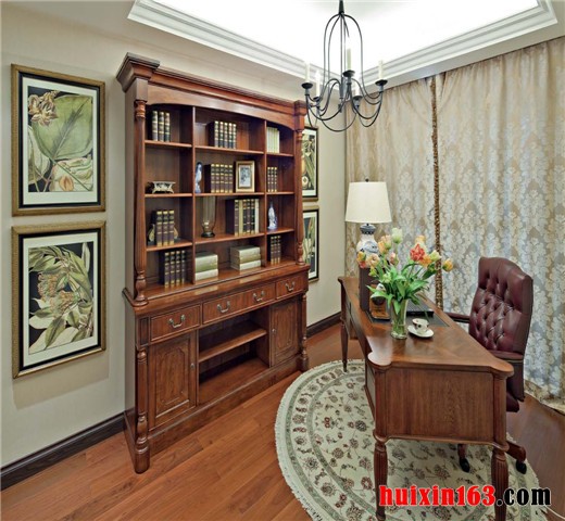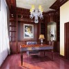 整体设计优雅别致、流畅自然。符合欧式系列家装的一惯特点。设计师在实际创作之前和业主进行了良好的沟通,将业主的意愿很好的融入到了具体的装修设计当中,并且做到了很好的协调处理,整体表现和谐自然,协调统一。表现出了欧式书房的特质和内在感。