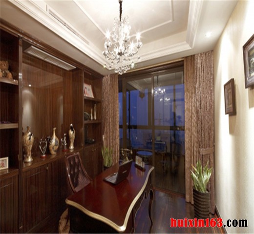 线条勾勒较其它常见设计风格来说,较为明显自然,能够体现欧式系列家装的大气从容之感。书房的功能性在得到体现的同时,十分注重舒适性的考虑。对书房用具的配置十分仔细。书架的阵设、书桌椅的搭配,都以欧式风格设计理念为依托,烘托出整个职能空间的的优雅气质。