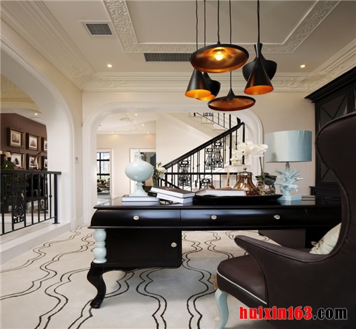 线条勾勒较其它常见设计风格来说,较为明显自然,能够体现欧式系列家装的大气从容之感。书房的功能性在得到体现的同时,十分注重舒适性的考虑。对书房用具的配置十分仔细。书架的阵设、书桌椅的搭配,都以欧式风格设计理念为依托,烘托出整个职能空间的的优雅气质。