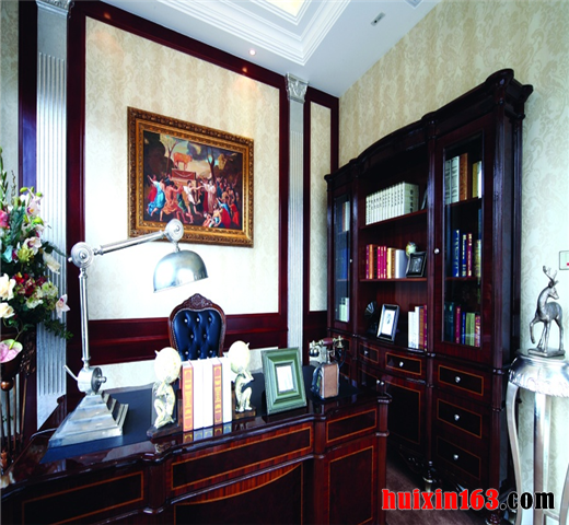 地面处理方面厚重大方,色彩处理优雅从容,材质选妥当合理,配合着欧式墙纸的尽情发挥,以顶层级分明的顶棚处理,三者协调处理,相互配合,相映成辉的表现着欧式风格书房的家装效果。整体和谐自然、协调统一。业主表示非常喜欢这样的设计效果。