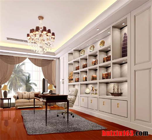 地面处理方面厚重大方,色彩处理优雅从容,材质选妥当合理,配合着欧式墙纸的尽情发挥,以顶层级分明的顶棚处理,三者协调处理,相互配合,相映成辉的表现着欧式风格书房的家装效果。整体和谐自然、协调统一。业主表示非常喜欢这样的设计效果。
