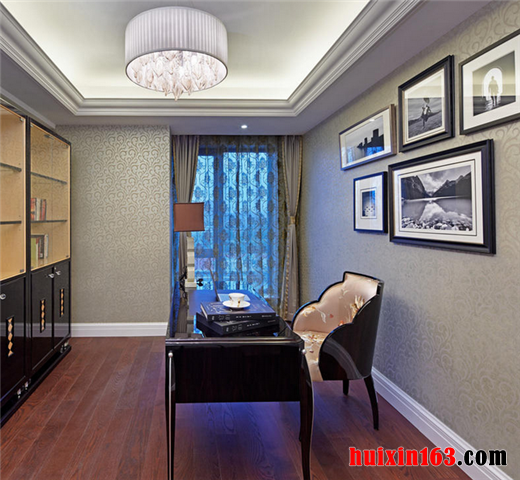 地面处理方面厚重大方,色彩处理优雅从容,材质选妥当合理,配合着欧式墙纸的尽情发挥,以顶层级分明的顶棚处理,三者协调处理,相互配合,相映成辉的表现着欧式风格书房的家装效果。整体和谐自然、协调统一。业主表示非常喜欢这样的设计效果。