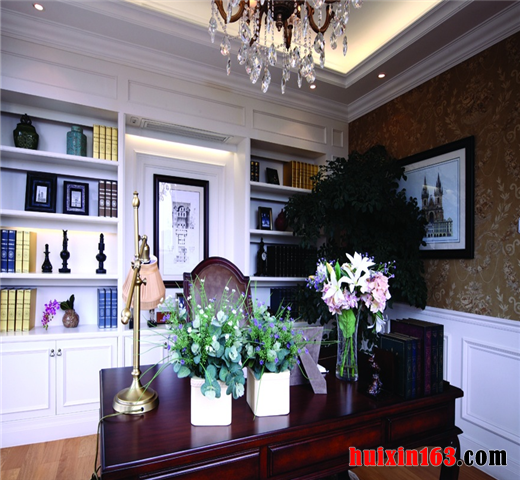 地面处理方面厚重大方,色彩处理优雅从容,材质选妥当合理,配合着欧式墙纸的尽情发挥,以顶层级分明的顶棚处理,三者协调处理,相互配合,相映成辉的表现着欧式风格书房的家装效果。整体和谐自然、协调统一。业主表示非常喜欢这样的设计效果。