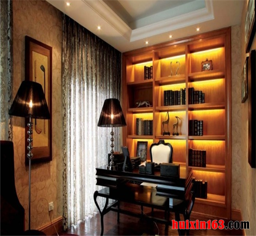 地面处理方面厚重大方,色彩处理优雅从容,材质选妥当合理,配合着欧式墙纸的尽情发挥,以顶层级分明的顶棚处理,三者协调处理,相互配合,相映成辉的表现着欧式风格书房的家装效果。整体和谐自然、协调统一。业主表示非常喜欢这样的设计效果。