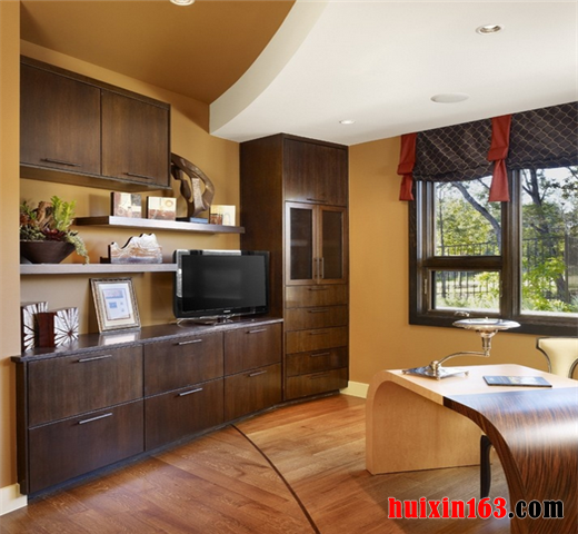 地面处理方面厚重大方,色彩处理优雅从容,材质选妥当合理,配合着欧式墙纸的尽情发挥,以顶层级分明的顶棚处理,三者协调处理,相互配合,相映成辉的表现着欧式风格书房的家装效果。整体和谐自然、协调统一。业主表示非常喜欢这样的设计效果。