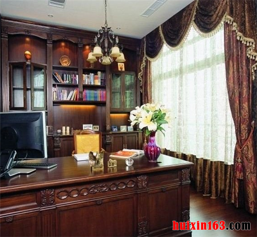 墙面处理方面主次分明、彰然有序。主体以鲜明的色彩来进行整体基调掌控。局部以与之相匹配的辅色作为点缀,欧式造型的墙纸拼贴体现着欧式风格的设计主题。欧式造型款式特征较为明显的桌椅柜等书房家具配置显示着欧式风情的具体可调,整体高雅大方,和谐自然。