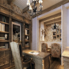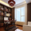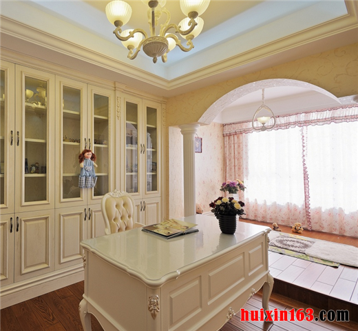 墙面处理方面主次分明、彰然有序。主体以鲜明的色彩来进行整体基调掌控。局部以与之相匹配的辅色作为点缀,欧式造型的墙纸拼贴体现着欧式风格的设计主题。欧式造型款式特征较为明显的桌椅柜等书房家具配置显示着欧式风情的具体可调,整体高雅大方,和谐自然。