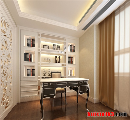 墙面处理方面主次分明、彰然有序。主体以鲜明的色彩来进行整体基调掌控。局部以与之相匹配的辅色作为点缀,欧式造型的墙纸拼贴体现着欧式风格的设计主题。欧式造型款式特征较为明显的桌椅柜等书房家具配置显示着欧式风情的具体可调,整体高雅大方,和谐自然。