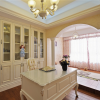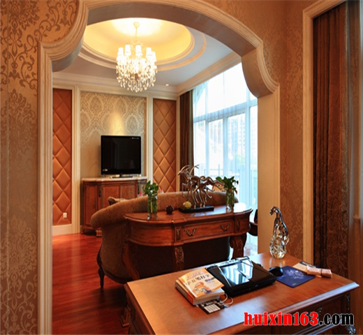 墙面处理方面主次分明、彰然有序。主体以鲜明的色彩来进行整体基调掌控。局部以与之相匹配的辅色作为点缀,欧式造型的墙纸拼贴体现着欧式风格的设计主题。欧式造型款式特征较为明显的桌椅柜等书房家具配置显示着欧式风情的具体可调,整体高雅大方,和谐自然。