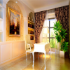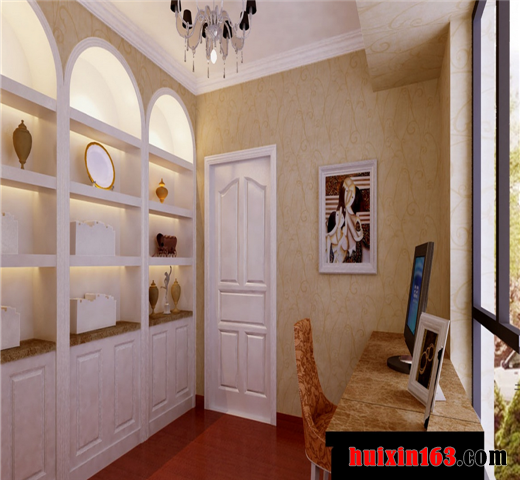 墙面处理方面主次分明、彰然有序。主体以鲜明的色彩来进行整体基调掌控。局部以与之相匹配的辅色作为点缀,欧式造型的墙纸拼贴体现着欧式风格的设计主题。欧式造型款式特征较为明显的桌椅柜等书房家具配置显示着欧式风情的具体可调,整体高雅大方,和谐自然。