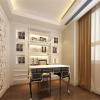 墙面处理方面主次分明、彰然有序。主体以鲜明的色彩来进行整体基调掌控。局部以与之相匹配的辅色作为点缀,欧式造型的墙纸拼贴体现着欧式风格的设计主题。欧式造型款式特征较为明显的桌椅柜等书房家具配置显示着欧式风情的具体可调,整体高雅大方,和谐自然。