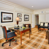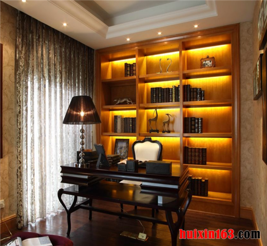 墙面处理方面主次分明、彰然有序。主体以鲜明的色彩来进行整体基调掌控。局部以与之相匹配的辅色作为点缀,欧式造型的墙纸拼贴体现着欧式风格的设计主题。欧式造型款式特征较为明显的桌椅柜等书房家具配置显示着欧式风情的具体可调,整体高雅大方,和谐自然。