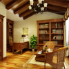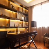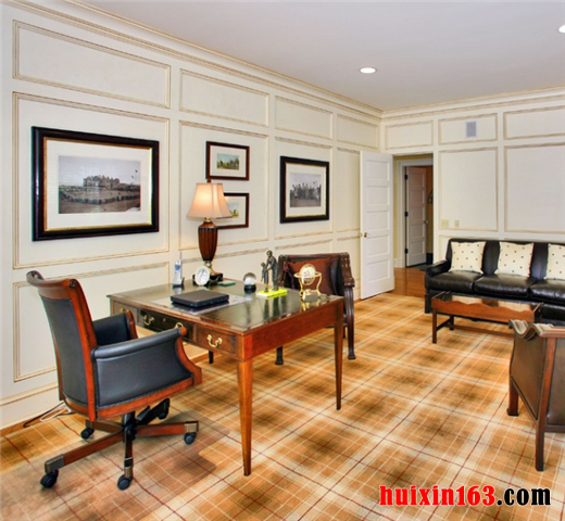 墙面处理方面主次分明、彰然有序。主体以鲜明的色彩来进行整体基调掌控。局部以与之相匹配的辅色作为点缀,欧式造型的墙纸拼贴体现着欧式风格的设计主题。欧式造型款式特征较为明显的桌椅柜等书房家具配置显示着欧式风情的具体可调,整体高雅大方,和谐自然。