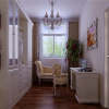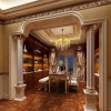 顶棚处理方面既能体现出欧式风格一惯的厚重大气,又在细节方面展现出了低调含蓄的简洁之风,两者做到了有效的统一,自然天成,浑然一体。同时,与墙壁连接处的线条勾勒,配合着欧式造型墙纸的拼贴,加上地面色彩的调和,整体彰显从容不迫、沉着稳重的气息。