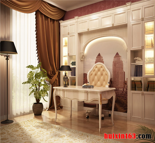 细节处理方面讲究干练自然,以很好的表现设计主题为目的,强调欧式风格的理念存在,把欧式风格系列家装的精髓之处,充分用在书房的处理上,意在体现书房的高雅气质,同时,将欧式风格的理念表现出来。整体处理和谐统一、协调一致。表现出宁静自然、优雅和谐的氛围。