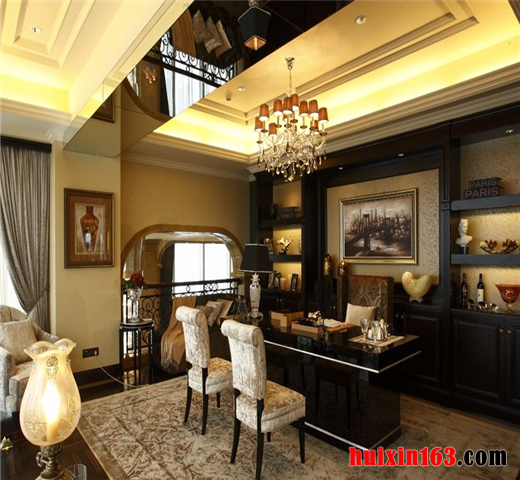 和谐自然的环境布置,使得整个职能空间有种浑然天成的宁静之感,十分符合书房的功能性设计。空间氛围对装修效果格外重要。而此种欧式风格书房的装修效果,既能体现出欧式家装的特征,又将书房的书卷气息和舒适温馨的实用性功能结合在一起,达到了良好的效果。