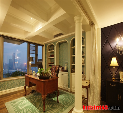 设计师通过此案很好的把握住了此种风格的设计理念,以厚重大方,优雅别致的基调惯始终。无论是色彩和线条的处理,或者是地面、墙面、顶棚的材质选择,再或者是三者的色调构成,都讲究协调统一的处理原则,同时,和书房家具配置的点缀相辅相承,呈现统一的布局力度。