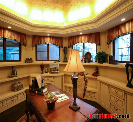 设计师通过此案很好的把握住了此种风格的设计理念,以厚重大方,优雅别致的基调惯始终。无论是色彩和线条的处理,或者是地面、墙面、顶棚的材质选择,再或者是三者的色调构成,都讲究协调统一的处理原则,同时,和书房家具配置的点缀相辅相承,呈现统一的布局力度。