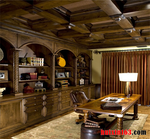 设计师通过此案很好的把握住了此种风格的设计理念,以厚重大方,优雅别致的基调惯始终。无论是色彩和线条的处理,或者是地面、墙面、顶棚的材质选择,再或者是三者的色调构成,都讲究协调统一的处理原则,同时,和书房家具配置的点缀相辅相承,呈现统一的布局力度。