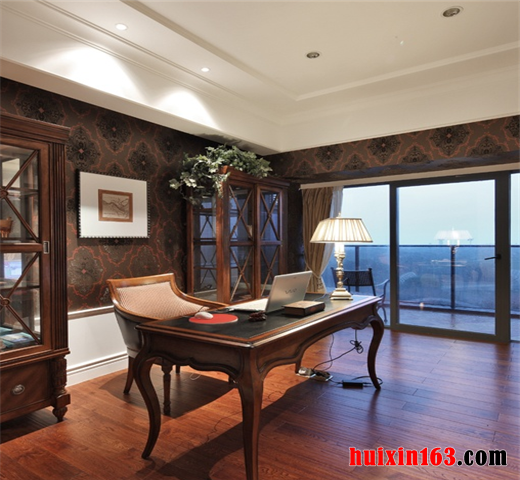 设计师通过此案很好的把握住了此种风格的设计理念,以厚重大方,优雅别致的基调惯始终。无论是色彩和线条的处理,或者是地面、墙面、顶棚的材质选择,再或者是三者的色调构成,都讲究协调统一的处理原则,同时,和书房家具配置的点缀相辅相承,呈现统一的布局力度。