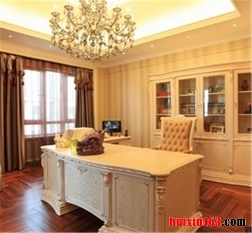 设计师通过此案很好的把握住了此种风格的设计理念,以厚重大方,优雅别致的基调惯始终。无论是色彩和线条的处理,或者是地面、墙面、顶棚的材质选择,再或者是三者的色调构成,都讲究协调统一的处理原则,同时,和书房家具配置的点缀相辅相承,呈现统一的布局力度。